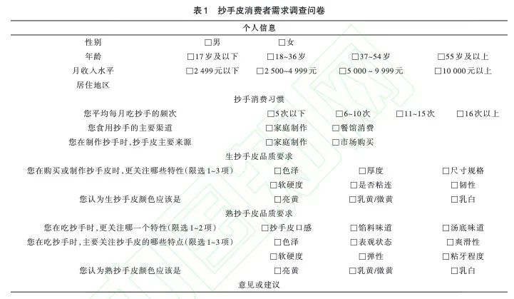参考徐渊设计的调查方法,以及黄敏口和熊娟对馄饨的感官评价方法,结合作者团队前期在重庆地区市场走访调查的结果,设计抄手皮消费者需求调查问卷,主要包括个人信息、抄手消费习惯、生抄手皮品质需求、熟抄手皮品质需求、意见与建议四部分(表1) 。