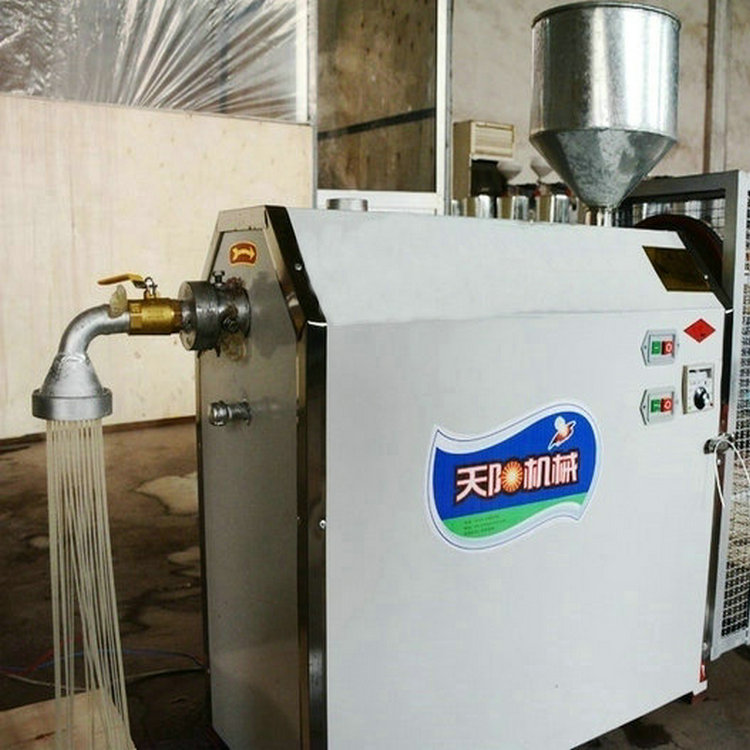 河粉为南方的一种米制小吃,又称沙河粉,粿条,白而透明、晶莹剔透,比较适合配鸡肉、排骨或蔬菜等一同食用。口感韧而爽滑,有特殊的米香,可拌可炒,早餐、夜市必不可少,深受人们欢迎,日销量好。市场需求较大,加工利润相当稳定,天阳河粉机(粿条机)由电热温控装置,磨浆机,蒸粉水套和成型机头组成,借鉴传统工艺,采用水浴或蒸汽导热蒸粉新工艺,将米浆熟化成型。生产加工时把浸泡好的大米加河粉机的料斗内,自动磨浆,磨好的米浆在螺旋推进装置向前推送中自动蒸煮,自动挤压成型,由于推进过程中的米浆经 100 度沸水煮熟,没有破坏米浆的分子结构,保证了河粉的稳定性,改变了干摩擦式米线机温度忽高忽低,产品熟化不均匀,不耐煮、易断条的缺点。天阳河粉机更换相应的模具就能生产米线,米皮,米豆腐,东北馇条等食品,是门面加工店、餐厅食堂等加工米制食品的理想设备。天阳河粉机(粿条机)型号TYG-BM,电机220V1440转2.2-3KW,外型尺寸:1200*480*1350mm,重量100公斤,价格4800元/台,不锈钢型7600元/台(不含主电机和运费)。