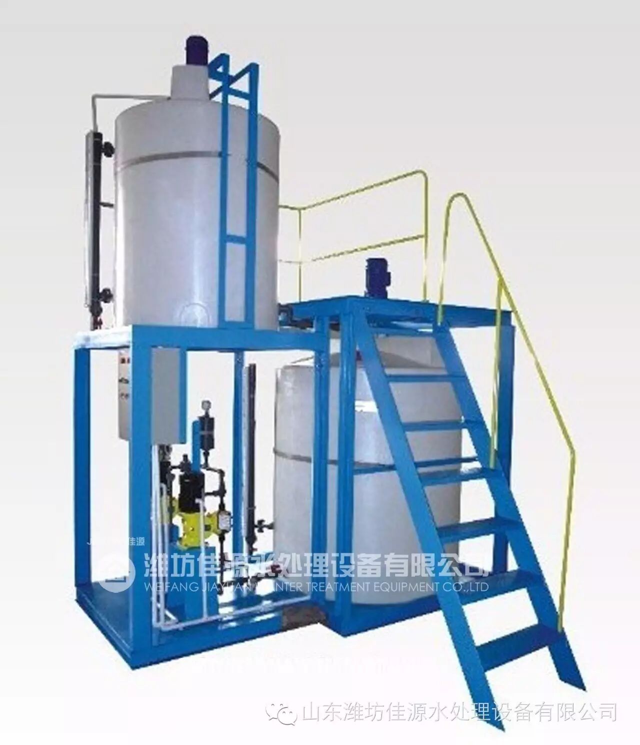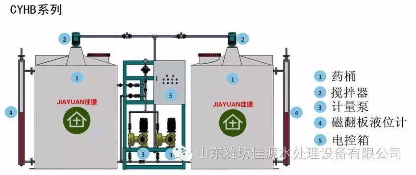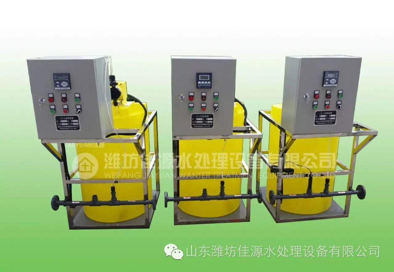 按比例将高浓度药剂和水加入溶液箱中进行搅拌,待配置成所需浓度的药剂时在由计量泵(又称加药泵)输送至加药点或指定的系统中;结构:主要由计量泵、搅拌箱、搅拌器、液位计、安全阀、压力表、缓冲器、对流器、各类阀门,支撑底座、楼梯扶手、电路控制部分,整套管理及附属部件组成;