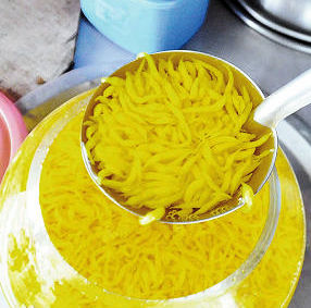 制作漏鱼有多种方法,可以用淀粉或面粉加水调成浆加工,也可以把大米浸泡磨浆后加工。水浆进入机器内通过电加热电子自动控温水浴煮浆熟化,然后通过模具,进入冷水中,成型的漏鱼象无数条银鱼或虾在水中游动,煞是好看。 漏鱼食用方便,冷热皆可,热食主要是煮了吃,里边放点红糖、酸菜,味道鲜美,冷食主要是凉拌,加上,辣椒油,油炸的花生米等各种作料,添加熬制的大料水或浆水,也可以加适当的放甜酸水。入口就咨溜一下滑入腹中。口感清凉爽滑,四季皆宜。