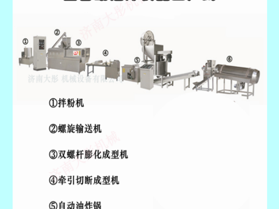 油炸类膨化食品生产线(大彤机械)可生产锅巴、麻花、薯条、妙脆角、皮萨卷等产品。面粉、淀粉等原料经过混料、挤压膨化、整形、油炸、调味、包装一次性完成,操作简单、流水线生产。生产的产品酥脆可口、油而不腻、色泽鲜亮,适合市场流行趋势