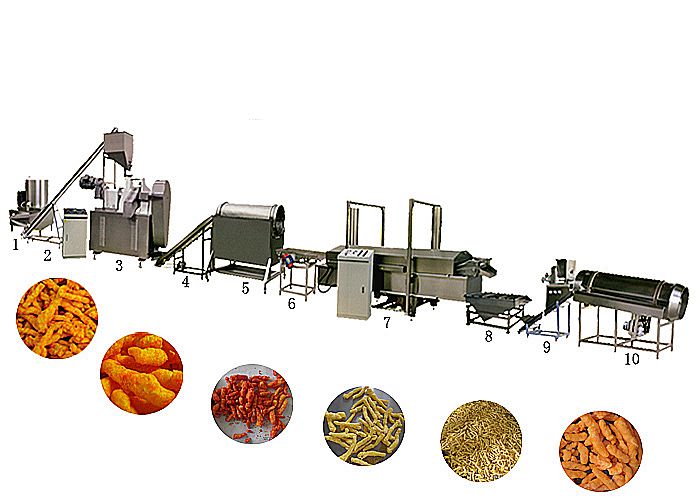 拌粉机→螺旋输送机→旋转头挤压机→提升机→滚筒筛→连续油炸机→单滚筒调味线→包装机