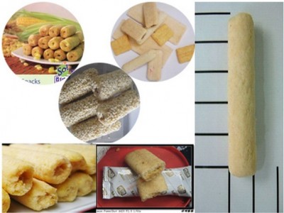 原料配制→拌粉机→输送机→挤压膨化机→注芯机→整形切断机→输送机→干燥机→喷油机→调味→枕式包装机。