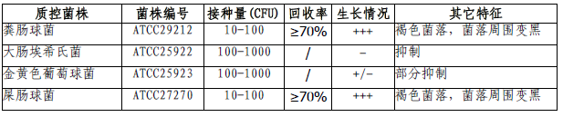 按标签用法制备培养基,接种以下质控菌株,放置35±2℃需氧培养24±2小时。