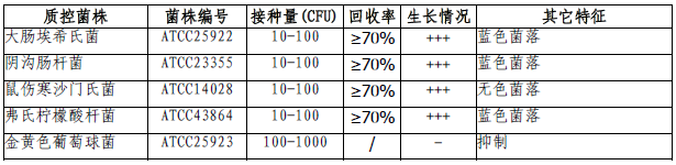 按标签用法制备培养基,接种以下质控菌株,放置36±1℃需氧培养18-24小时。
