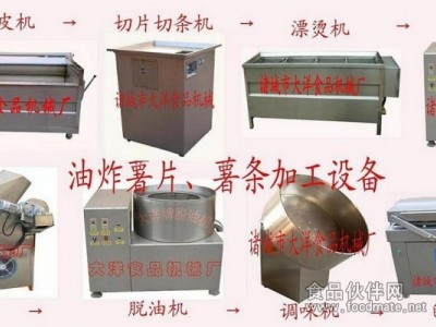 薯片薯条加工成套设备简介大洋牌薯片薯条加工成套设备包括:土豆红薯清洗脱皮机 → 薯片薯条机 → 漂烫机 → 脱水机油 → 水混合油炸机 → 油炸食品脱油机 → 油炸食品调味机(加料机)→ 真空、充氮包装机. 此套设备操作方便,产量高,成型好,所切薯片薯条表面光滑、均匀,粗细厚薄可以自由调节。新型节能油炸机有电加热、煤加热等多种形式,·整机采用进口优质不锈钢材料,工艺精湛、坚固耐用。采用智能型数字显示温控器,方便实用。设有超温保护装置,让您放心使用,是一种无烟型、多功能、水油混合式油炸设备,该设备采用了上的油水混合油炸工艺,彻底改变了传统油炸设备的结构,从根本上解决了传统式油炸锅的弊端,可同时炸制各种食物,互不串味,一机多用;所炸食物不但色、香、味俱佳,外观干净美观,且提高了产品品质,延长了货架期。该工艺采取从油层中部加热的方式,控制上下油层的温度,有效缓解炸油的氧化程度,抑制酸价升高,在油炸过程中自动过滤残渣,自动控温,从而延长炸油的使用寿命。经过对我厂节能油炸锅连续工作试验,其过氧化值和检验值均达到国家标准,大大延长了炸油的使用周期,减少浪费,比传统油炸锅节省炸油50%以上。适合于中、小型食品加工企业, 广泛用于宾馆、酒店、炸鸡店、快餐店、招待所、、院校、企业食堂、油炸食品企业及连锁店等企业使用。脱水、脱油机安装了防震系统,脱水、脱油过程中设备不会震动,利用离心原理,电磁刹车,数字自动控制,不锈钢制做,是目前国内的脱水、脱油设备。此套设备经销国内外,得到一致好评!