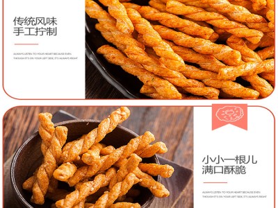 三、膨化油炸麻花生产线 油炸麻花生产设备 是公司根据国内外市场的需求,研制开发的膨化食品设备,其操作性能、产品质量、工艺口感均已达到同行业的先进水平。该生产线操作简单,易学易懂,是从事锅巴沙拉生产厂家理想的选择,可生产各种不同形状的锅巴沙拉妙脆角,其口感酥脆、油而不腻、食后留有余香、促进肠道消化之特点,使广大消费者茶余饭后的食品